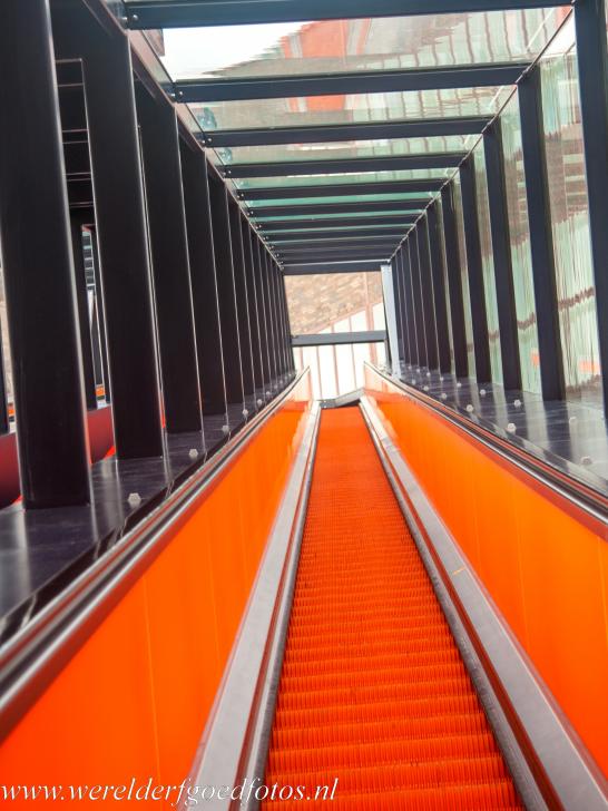 Zollverein Coal Mine Industrial Complex, Essen: The modern escalator leading up to the former coal washing plant. The bright orange escalator was designed by the renowned Dutch architect Rem Koolhaas. After riding the 55-metre-long escalator through a glass gangway, visitors reach the Visitor Centre and the Ruhr Museum in the former coal washing plant of the complex.