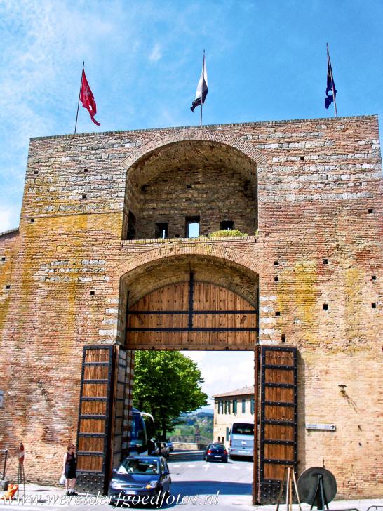 Historic Centre of Siena: One of the historic city gates of Siena. Siena is a small medieval city in Tuscany, situated about 40 km from San Gimignano and about 70 km from Florence. Siena has preserved its unique medieval architecture including the town walls and city gates. Siena is one of the most visited tourist attractions in Italy.