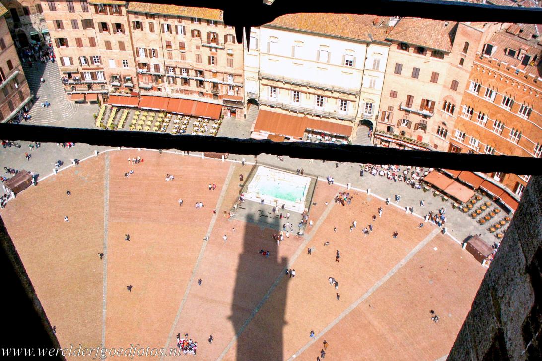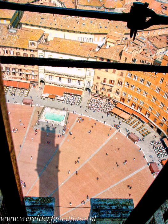 Historic Centre of Siena: The Piazza del Campo or Il Campo, the main square of Siena, seen from the Mangia Tower. The Mangia Tower was built between 1338 and 1348 and is 102 metres high. To reach the top, you have to climb more than 500 steps, the top of the tower offers wonderful views of Siena, the Piazza del Campo and the Gaia Fountain.