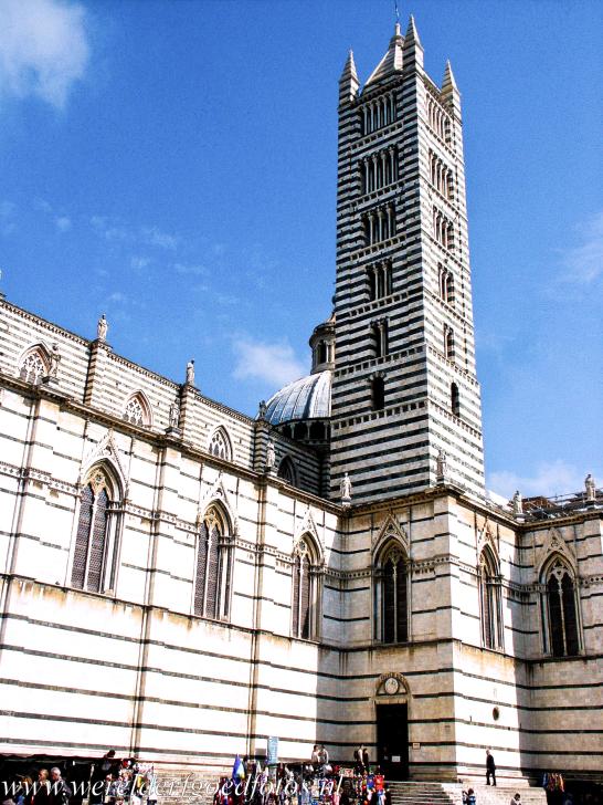 Historic Centre of Siena: Siena Cathedral and the campanile, the bell tower, were constructed of blackish-green and white marble, the symbolic colours of the city of Siena. The Romanesque campanile was completed in the 14th century. Siena Cathedral is one of the great examples of the Italian Gothic architecture. The historic centre of Siena is a UNESCO World Heritage.