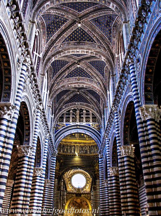 Historic Centre of Siena: The vaulted ceiling and the blackish-green and white marble columns of the nave of Siena Cathedral. The vaults are painted blue and adorned with numerous golden stars. The inner wall of the façade is decorated with 15th century reliefs, depicting the life of the Virgin Mary and the story of Sant'Ansano.