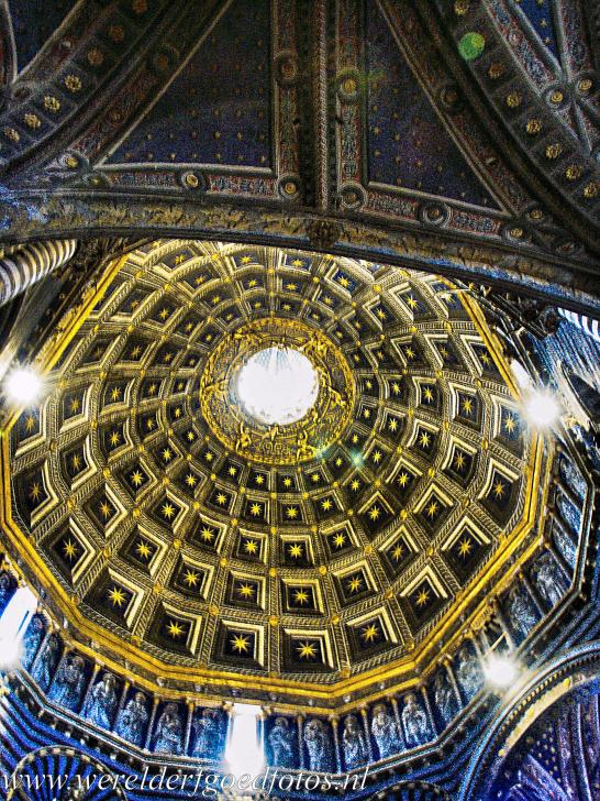 Historic Centre of Siena: The dome of Siena Cathedral is decorated with golden stars. The axis of Siena Cathedral runs north-south, rather unique among Christian churches. There were plans to double the size of the cathedral, but the money run out and the construction was stopped, the new nave is still unfinished.