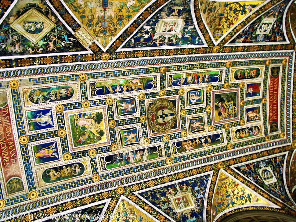 Historic Centre of Siena: The impressive vault of the Piccolomini Library, the library is situated inside Siena Cathedral, it was constructed around 1492 to house the collection of illuminated manuscripts of Pope Pius II, born as Enea Piccolomini, the walls and the vault are sumptuously adorned with frescoes, painted by Pinturicchio.