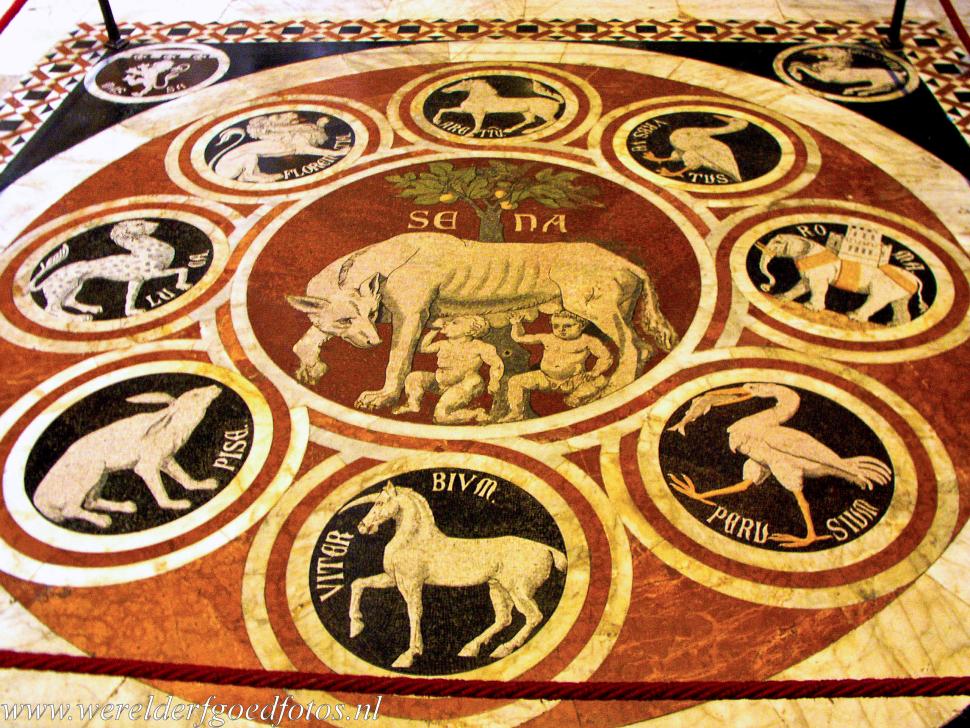 Historic Centre of Siena: The She-Wolf of Siena is one of the scenes in the inlaid mosaic floor of Siena Cathedral. The coloured marble mosaics cover the entire floor of Siena Cathedral. There are 56 mosaic scenes depicted on the floor. The She-Wolf of Siena is among the oldest mosaics in the cathedral. The She-Wolf is the symbol of the city of Siena.
