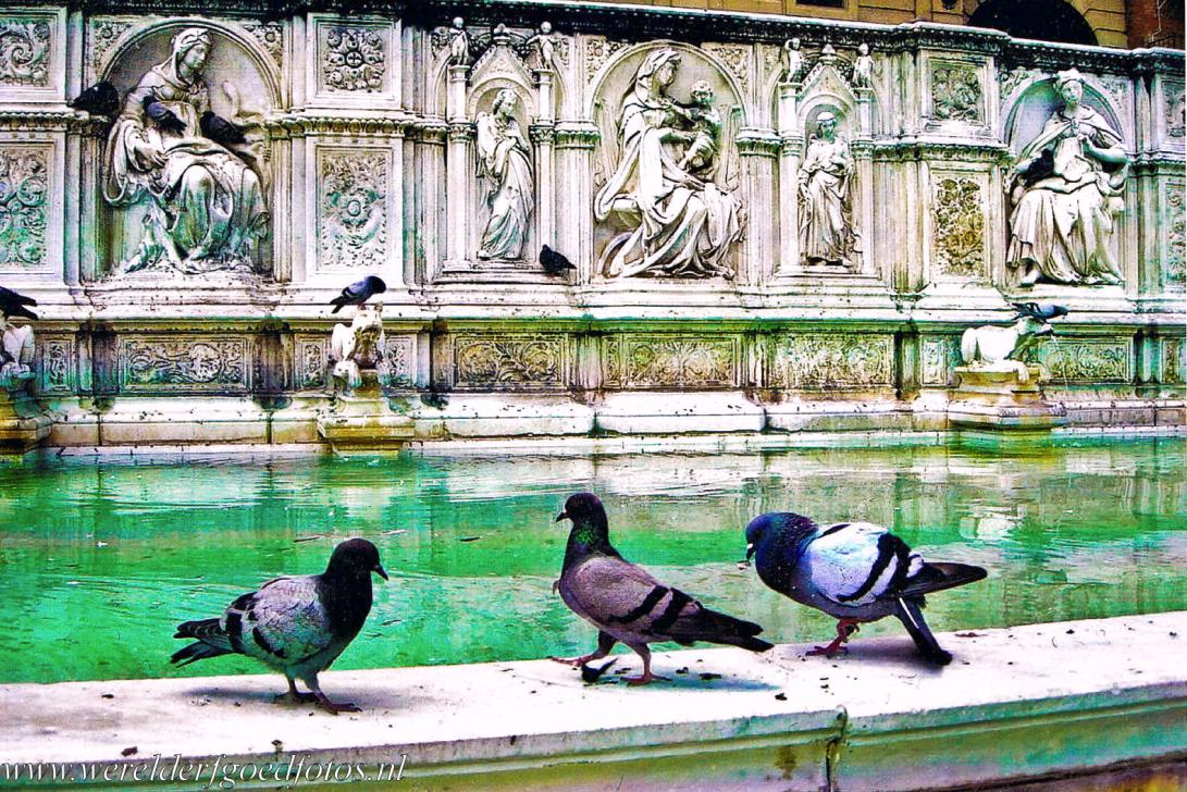 Historic Centre of Siena: The square Piazza del Campo and the famous Fonte Gaia Fountain, the sculpted wolves spouting water represent the mother-wolf of Romulus and Remus. The present fountain was built in 1419. The sculpted panels depict scenes from the Bible, the original marble panels of the Fonte Gaia Fountain were replaced by copies in 1858.