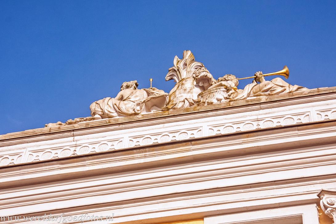 Castles of Augustusburg and Falkenlust in Brühl: The roofline of Augustusburg Castle. The castle is lavishly decorated both inside and outside. Augustusburg Castle and Falkenlust Castle, a small exquisite Rococo hunting lodge, are situated in the German town of Brühl, approximately 20 km southwest of the historic town of Cologne. The Castles of Augustusburg and Falkenlust at Brühl were declared a UNESCO World Heritage in 1984.