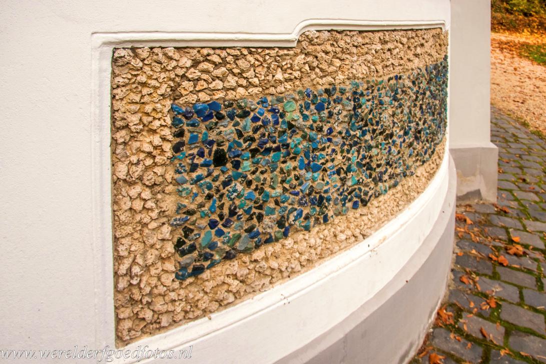 Castles of Augustusburg and Falkenlust at Brühl: A detail of the Chapel of St Mary of Egypt. The chapel stands near Falkenlust Castle, the Rococo hunting lodge in Augustusburg Park. The tiny chapel is lavishly decorated both inside and out with shells and semi-precious stones, including the deep-blue semi-precious stone lapis lazuli. Notably, several of the shell species featured in the decoration are now extinct.