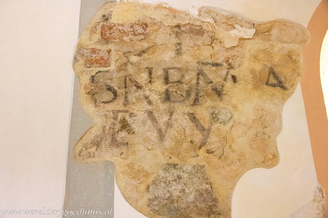 Abbey of Lorsch: One of the murals inside the King's Hall. Nine different layers of painting were found during restoration; the oldest mural dating back to 830, the last from the 17th century. The Abbey of Lorsch is situated in the town of Lorsch, about 18 km east of the city of Worms in Germany. The King's Hall is only accessible via a guided tour.