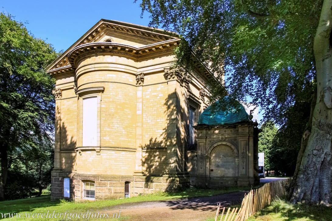 Workers' village Saltaire: The former Congregational Church, now the Saltaire United Reformed Church. The church was built in 1858-1859. The mausoleum (at the right hand side) is the final resting place of Titus Salt. The original six bells of the tower were removed and melted down for munitions in 1933. The tower nowadays houses a new peal of bells cast by Royal Eijsbouts in the Netherlands. These bells carry the biblical names Mary, Peter, Lydia, Jonathan, Martha and Titus.