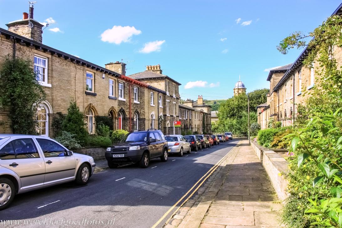 Saltaire: A row of 19th century small workers' houses, with the bell tower of the Saltaire United Reformed Church in the background. The houses of Saltaire were provided with running water and indoor water closets, and gas was supplied for heating and lighting. Saltaire is not only a historic monument, it is a UNESCO World Heritage where people live and work. Saltaire is a well preserved Victorian village.