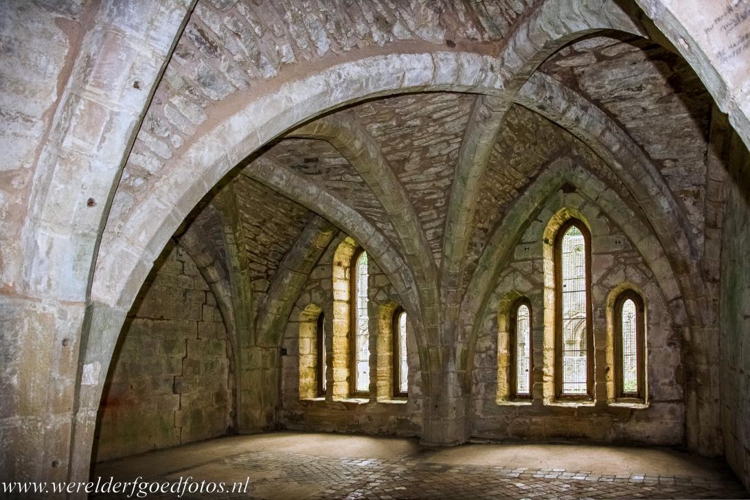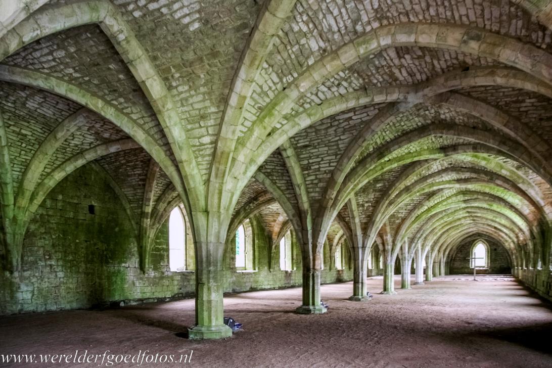 Studley Royal Park including the ruins of Fountains Abbey: The cellarium of the abbey was used to store food, ale and wines. A river is running underneath the cellarium. Fountains Abbey was one of the richest monasteries of England until the Dissolution of the Monasteries by Henry VIII in 1539. The imposing vaulted ceiling of the cellarium has remained completely intact.