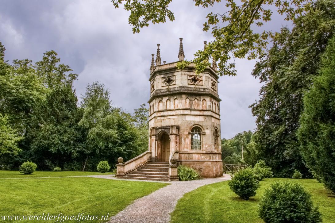 Studley Royal Park including the ruins of Fountains Abbey: The Octagon Tower was built in 1738. The Octagonal Tower is a tiny ornamental building in the neo-Gothic style, it is located along the High Ride path near the Serpentine Tunnel, a winding and completely dark tunnel between the High Ride path and the Temple of Piety. Studley Royal Park and the ruins of Fountains Abbey are located close to Ripon in North Yorkshire, England.