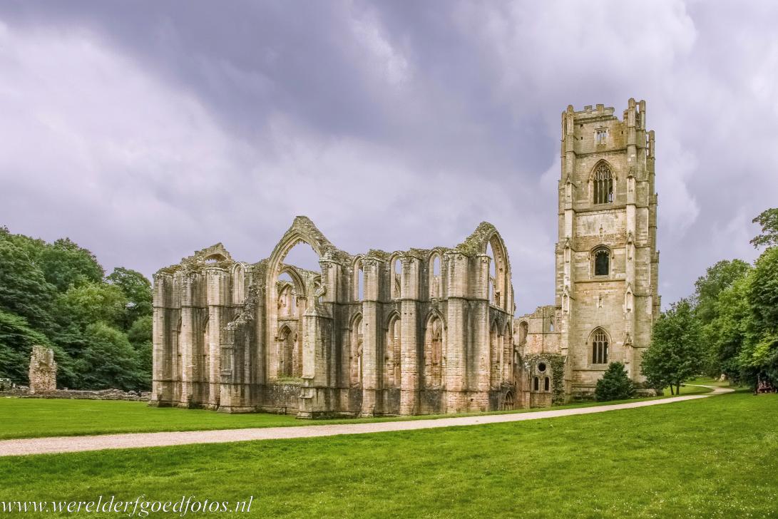 Fountains Abbey is one of the largest monastic ruins in Britain. The abbey was founded in 1132. The ruins of Fountains Abbey are largely of the Romanesque period, the church tower and some other parts were built later. The Studley Royal Park including the ruins of Fountains Abbey were inscribed on the UNESCO World Heritage List in 1986.