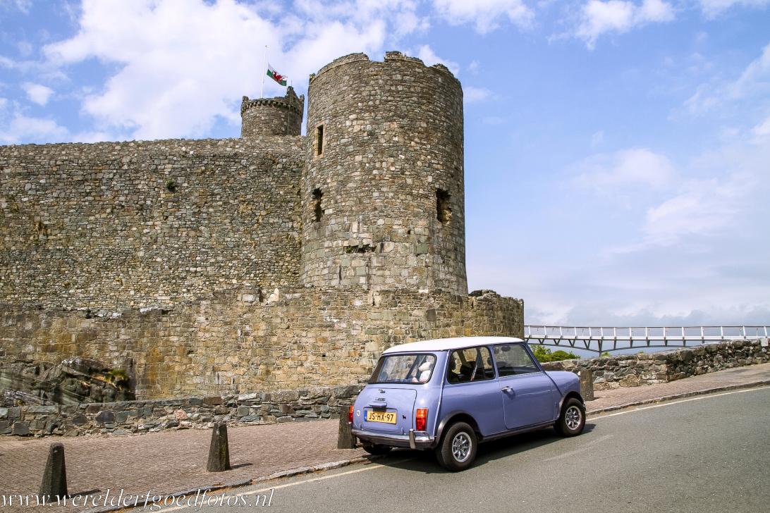 A classic Mini Authi in front of Harlech Castle. A new bridge was installed at Harlech Castle in January 2015. The steel footbridge replaces the former wooden steps. The forty-six metres long footbridge links Harlech Castle with the new visitor centre, situated opposite the castle. Now, visitors can enter the castle through the original 13th century entrance.