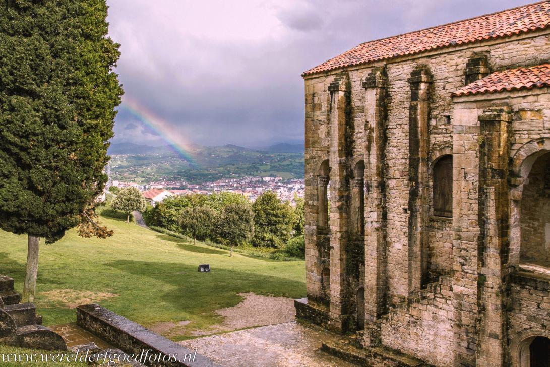 Monuments of Oviedo and the Kingdom of the Asturias: The Asturian pre-Romanesque Church of Santa María del Naranco, St. Mary at Mount Naranco. After a severe thunderstorm and heavy rainfall, a magnificent rainbow appeared over the town of Oviedo and the surrounding hills. The Asturian pre-Romanesque Church of Santa María del Naranco and the nearby Church of San Miguel de Lillo can be visited only by a guided tour.
