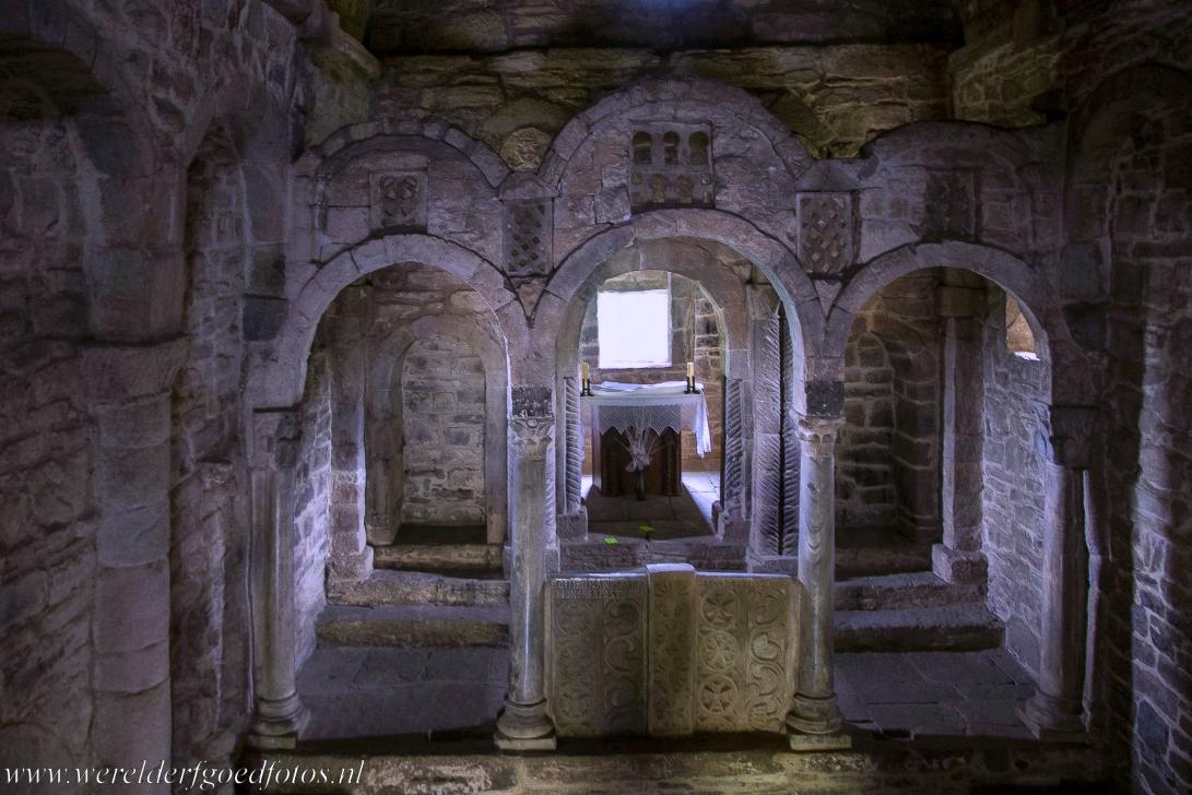 Monuments of Oviedo and the Kingdom of the Asturias: The decorated interior of the Asturian pre-Romanesque church of Santa María del Naranco. The vaulted hall of the upper floor has six blind arches supported by columns built into the wall. The rectangular building has two floors, the lower level or crypt has three chambers, the ceiling is made of wood. The altar is situated outside the church. The altar has a Latin inscription dating from 26 June 848.