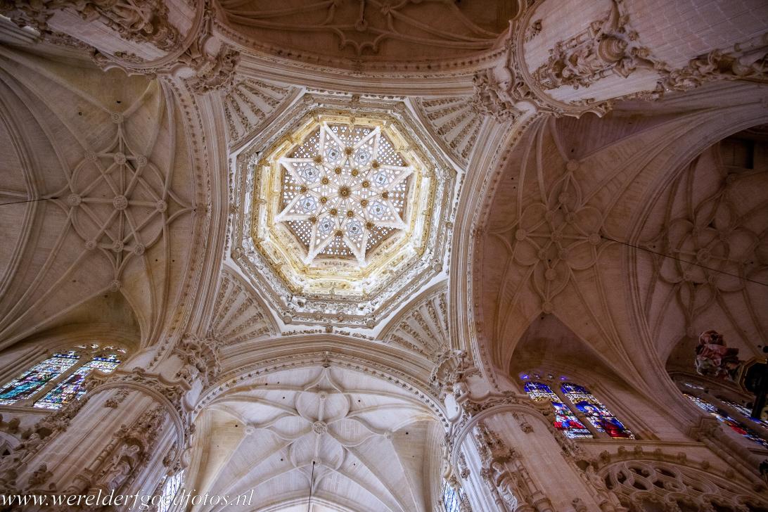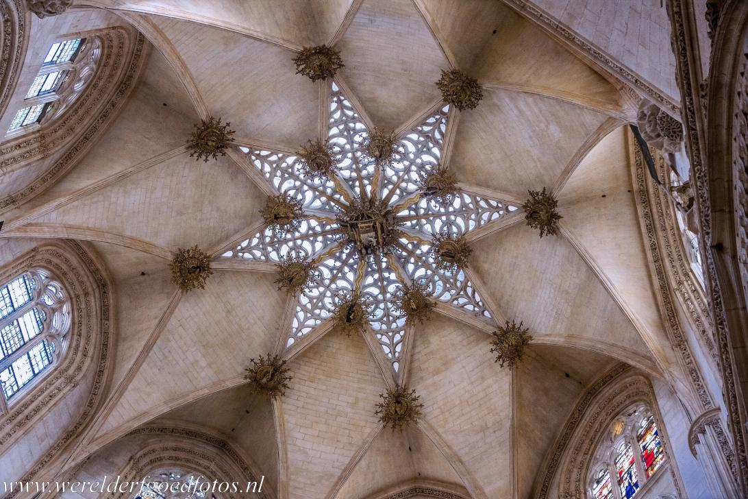 Burgos Cathedral: The star-shaped vault of the 15th century Chapel of the Condestable. In the side-naves of Burgos Cathedral are nineteen chapels, the most outstanding are the Santa Tecla Chapel and Chapel of the Condestable, built in the Flamboyant Gothic style. Burgos Cathedral was inscribed on the UNESCO World Heritage List in 1984.
