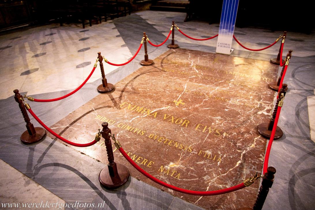 Burgos Cathedral: The tomb of El Cid Campeador, a legendary Spanish hero and icon. The tomb of El Cid, Rodrigo Díaz de Vivar, is situated below the lantern of the transept. El Cid died in 1099. He was buried in San Pedro de Cardeña. His mortal remains were moved many times. Finally in 1921, El Cid was interred in Burgos Cathedral, his final resting place.