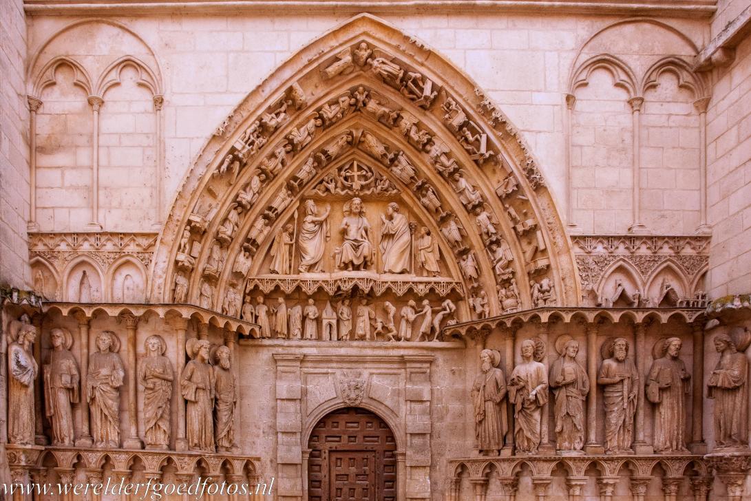 Burgos Cathedral: The Portada del Sarmental is the south portal, the portal is considered to be the most magnificent portal of the cathedral. The Portada del Sarmental was built in the period 1230 to 1240. The tympanum depicts Christ the Master, the four evangelists, the statues of the twelve apostles, the door jambs are adorned with the statues of Old Testament Kings.