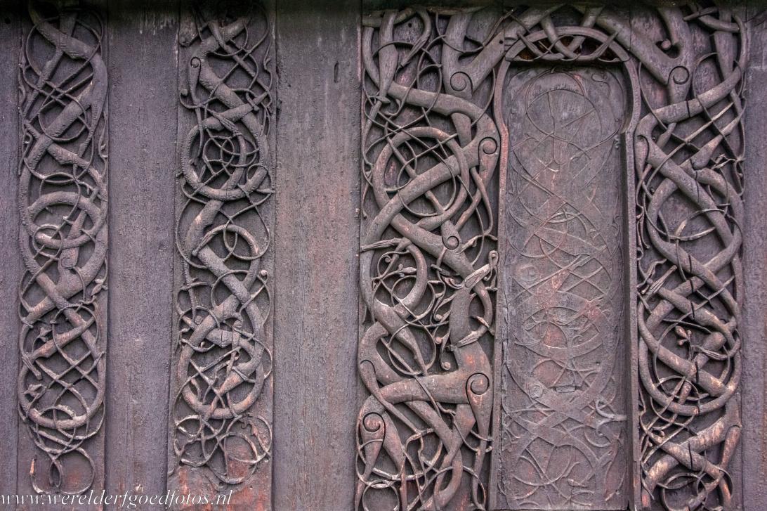 Urnes Stave Church: The original decorated sections from an earlier church have been used on the northern wall, probably parts of the portal, wall planks and a corner post. In the field on the lower left there is a lion with characteristic mane. Over and around the lion there is a network of snakes and ring shaped animals. It is possible that the decorations of the earlier stave church depict scenes from Norse mythology, or the eternal fight between good and evil.