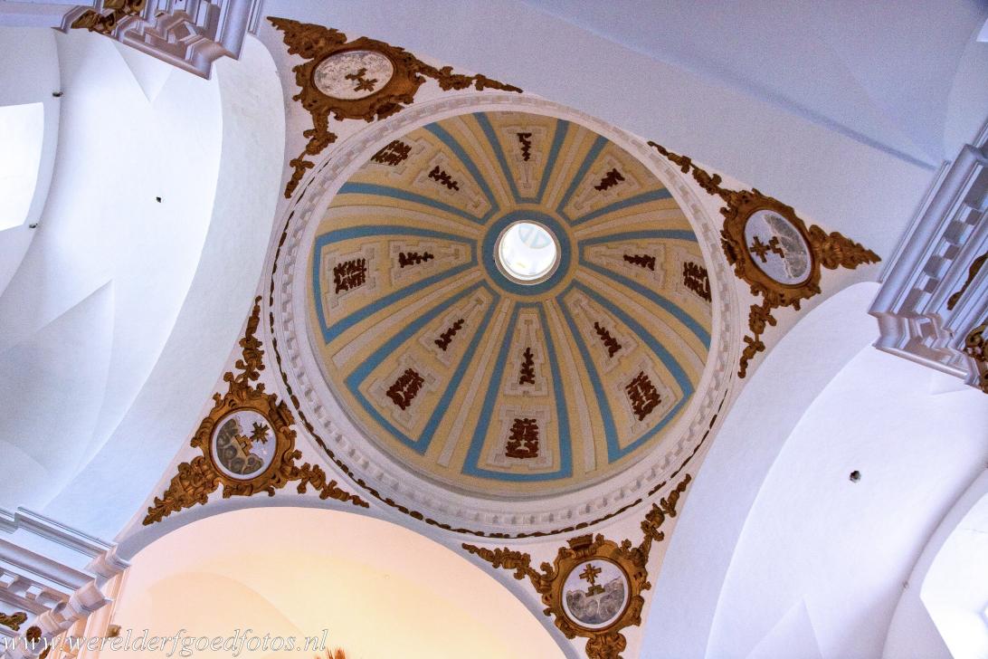 Old Town of Cáceres: The decorated dome of the San Francisco Javier Church. The Jesuit church has a single nave and several small side chapels. The main altarpiece has been placed between four gold plated Corinthian columns, the painting depicts the Miracle of Saint Francis Xavier and the Crab. The church has a ground plan in the form of a Latin cross, the shape of most western cathedrals and large churches. The church is also known as the Church of the Precious Blood.