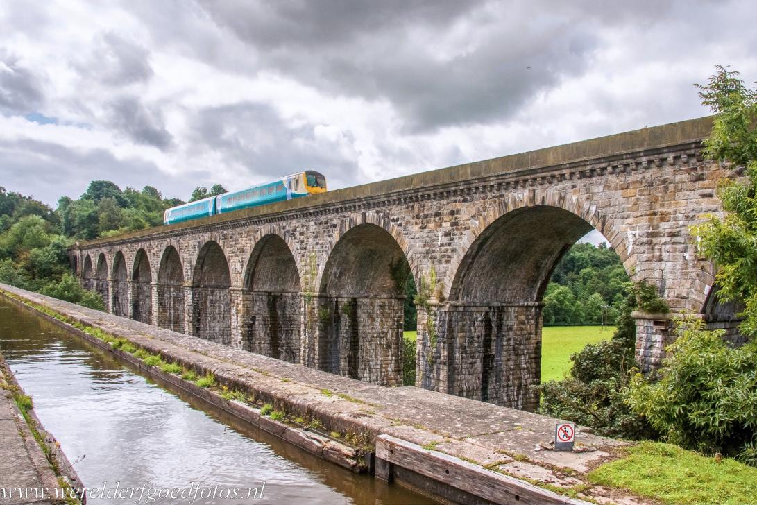 The Chirk Aqueduct and the Chirk Railway Viaduct. The Chirk Aqueduct was designed by Thomas Telford and completed in 1801. The Chirk Aqueduct is 220 metres long and 21 metres high. The masonry walls hide a cast-iron trough. The Chirk Railway Viaduct is slightly higher than the Chirk Aqueduct and was built later alongside the aqueduct.