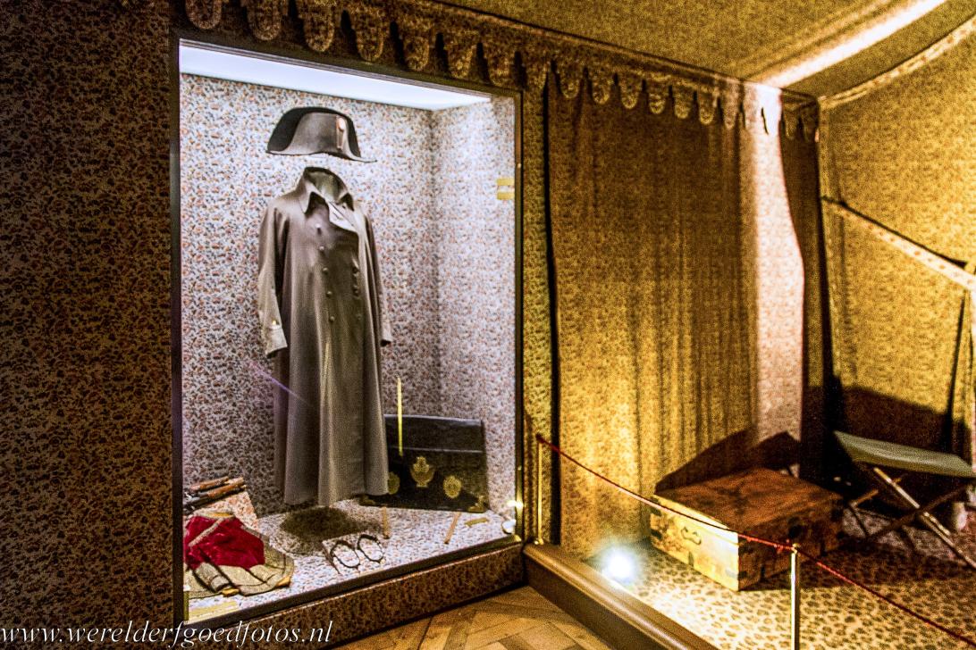 The Palace and Park of Fontainebleau: The long coat and bicorne of Napoleon Bonaparte. One of the wings of the palace houses the Napoleon I Museum. The museum houses a collection of furniture, paintings, sculptures, gold and silverware, costumes and documents of the imperial family, among the objects are the long coat and the famous bicorne hat of Napoleon Bonaparte and also objects from his military campaigns.