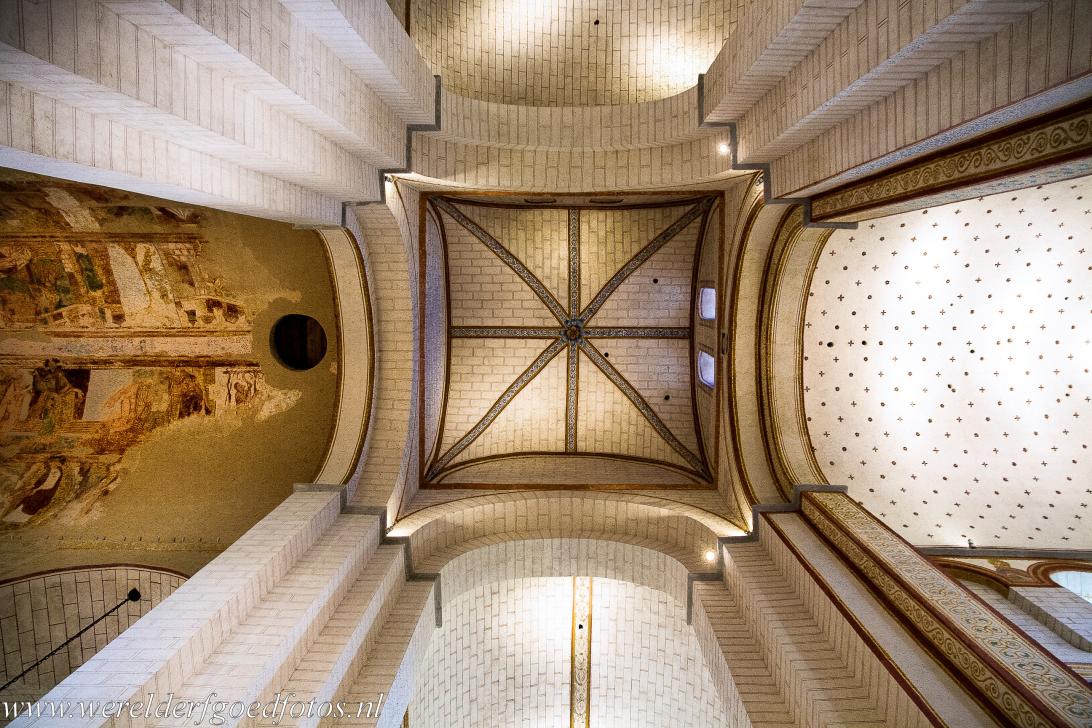 The Abbey Church of Saint-Savin-sur-Gartempe is located in Saint-Savin-sur-Gartempe, a tiny village east of Poitiers. The abbey church is the largest hall church in the Nouvelle-Aquitaine region in France. After the discovery of the bodies of the martyrs Cyprian and Savin, the abbey was almost certainly founded by Charles the Great, also known as Charlemagne. A crypt was built to house the tombs of the martyrs. This crypt survived until the present day. The Abbey Church of Saint-Savin-sur-Gartempe was built in the 11th century and expanded in the 13th century, the Gothic spire of the church was added in the 14th century. The barrel vaulted nave is supported by beautiful columns with carved capitals. The barrel vault of the nave, the choir, the crypt, the gallery and the porch of the abbey church are adorned with 11th century murals. The murals of the vault illustrate biblical stories from the Old Testament, events from Genesis and Exodus such as the Creation of Heaven and Earth, Adam and Eve, the Temptation and Fall of Man, the story of Cain and Abel, the Great Flood, the Ark of Noah, the Crossing of the Red Sea, the Tower of Babel. The tympanum above the doorway and the ceiling of the porch are adorned with murals depicting the Apocalypse, the upper tribune of the porch is decorated with murals depicting the Passion of Christ, the choir is decorated with murals of saints and the walls of the crypt are embellished with murals depicting the lives and martyrdoms of the Saints Savin and Cyprian. The Romanesque church is also known as the 'Romanesque Sistine Chapel'. In 1983, the Abbey Church of Saint-Savin-sur-Gartempe gained the status as a UNESCO World Heritage.