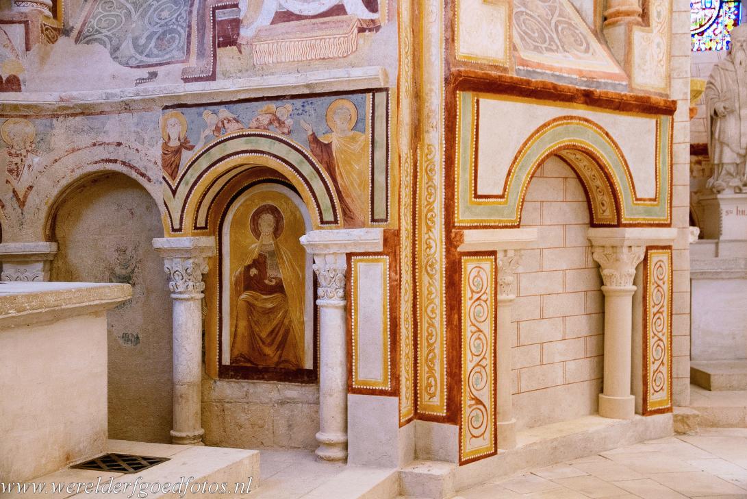 The choir of the Abbey Church of Saint-Savin-sur-Gartempe is embellished with murals of saints. The walls and the vault of the crypt are adorned with murals depicting the lives and martyrdoms of Saint Savin and Saint Cyprian. The Abbey of Saint-Savin-sur-Gartempe was probably founded by Charlemagne (747-814), the Holy Roman Emperor.
