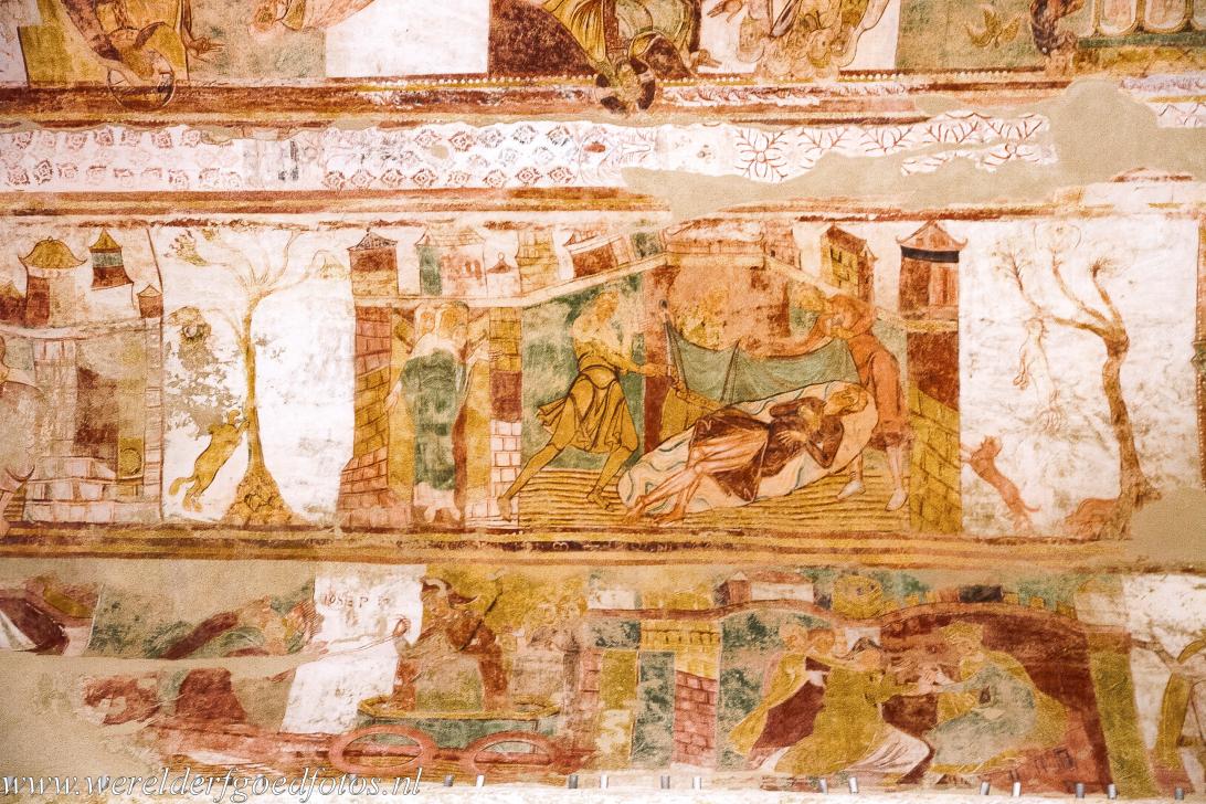 Abbey Church of Saint-Savin-sur-Gartempe: A Romanesque mural depicting the biblical story of the Drunkenness of Noah. The Romanesque murals escaped the ravages of several wars, such as the French Wars of Religion and the French Revolution. The imposing murals are remarkably well preserved. The Abbey Church of Saint-Savin-sur-Gartempe is part of a former Benedictine abbey.