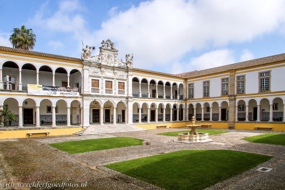 Historic Centre of Évora: The arcaded courtyard of the Colégio do Espírito Santo ( College of the Holy Spirit), the main building of the University of Évora. The Society of the Jesuits founded the university, the Jesuits were expelled from Portugal in the 18th century. The University of Évora was closed in 1779. The university was reopened in 1973, nearly two hundred years later.