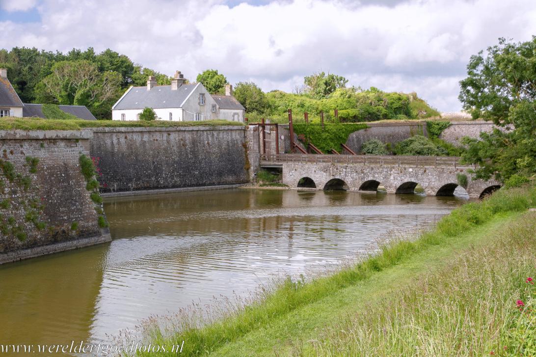 Fortifications of Vauban at Saint-Vaast-la-Hougue and Tatihou, the Vauban Towers: Le Pont Dormant (sleeping bridge) across the moat of Fort de la Hougue. Sleeping bridges were used in case of an attack by the enemy. The defenders of the fort just lifted the bridge deck and lowered it into the moat. In times of peace, the bridge deck remained in its place. Behind the centuries-old wall of the fort stands the building of a modern signal station.