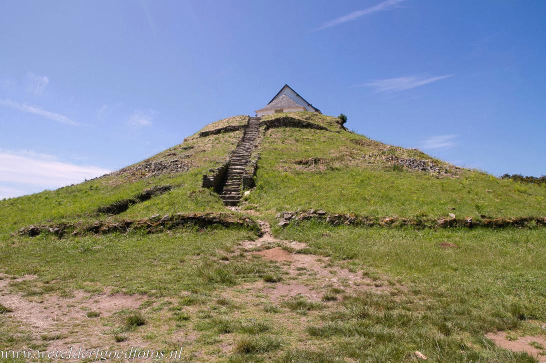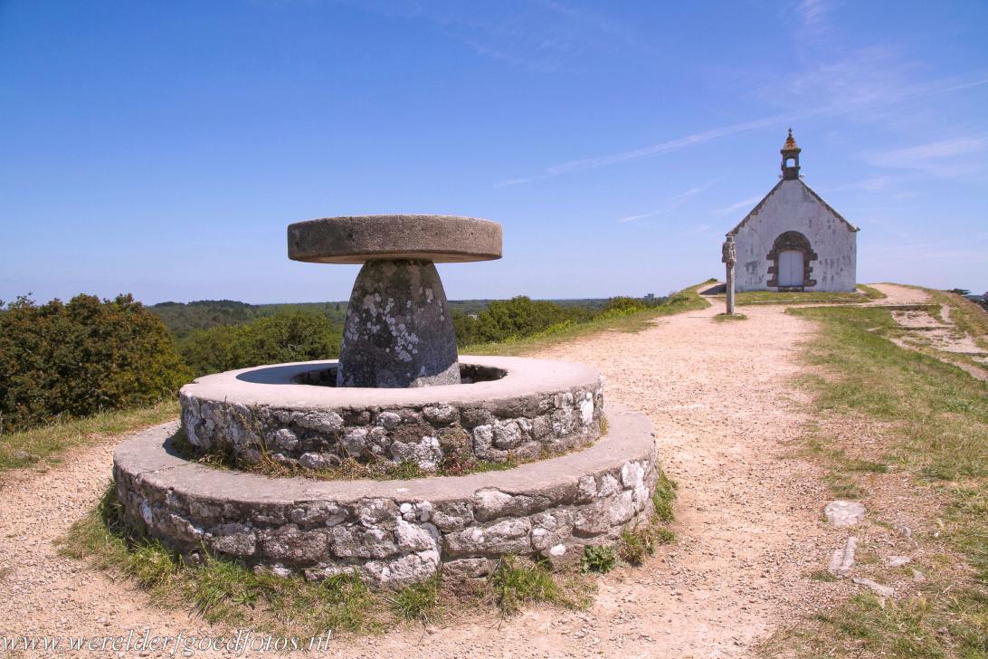 Neolithic Carnac, Morbihan Region in Brittany: The Chapel of Saint Michel on top of the Tumulus Saint Michel. The first chapel was built in 1664, and rebuilt on the same design around 1813, and again in 1925. The Tumulus Saint Michel was built on the highest point in Carnac. it offers amazing views over the entire Carnac area and Quiberon Bay. At the foot of the tumulus stands the Fountain of Saint-Michel. Women whose husbands were at sea came here to pray for a safe journey. The Tumulus of Saint Michel is the most prominent tumulus in Carnac and the shores of the Morbihan.
