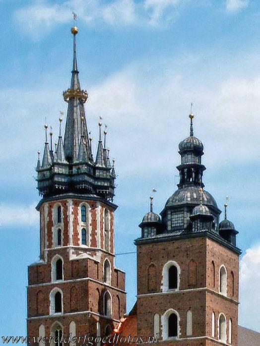 Historic Centre of Kraków: The 13th century Basilica of the Virgin Mary. The Basilica of the Virgin Mary is situated in the main Market Square Rynek Glówny in Kraków. The Basilica of the Virgin Mary is probably the most famous church in Poland. The lower tower is 69 metres high, it has a Renaissance roof and houses five bells. The tallest tower is 81 metres high, it has a Gothic spire and gold plated crown. The Kraków trumpet signal, the Hejnał Mariacki, is played by a trumpeter each hour from the highest tower of the basilica.