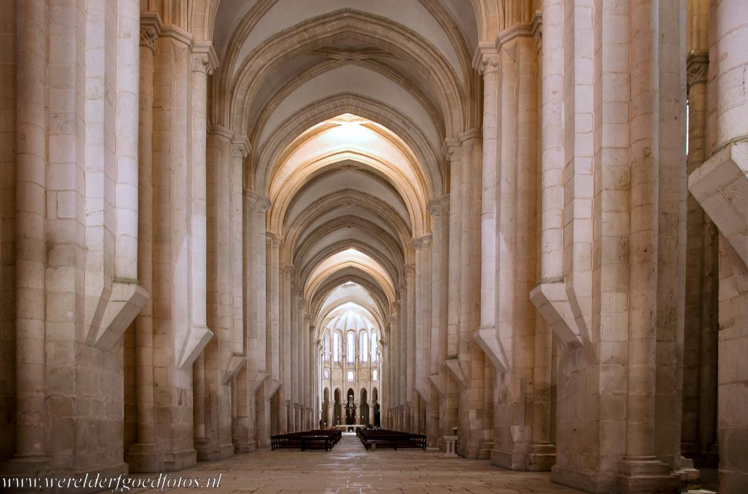 Klooster van Alcobaça: Het buitengewoon hoge middenschip van de kloosterkerk is het hoogste middenschip, dat in de middeleeuwen in Portugal werd gebouwd. Het middenschip is twintig meter hoog. De zijbeuken van de kerk hebben eveneens een hoogte van twintig meter. In het transept van de kloosterkerk van Alcobaça staan twee tombes in flamboyant-gotische stijl, de mooiste middeleeuwse tombes van Portugal.