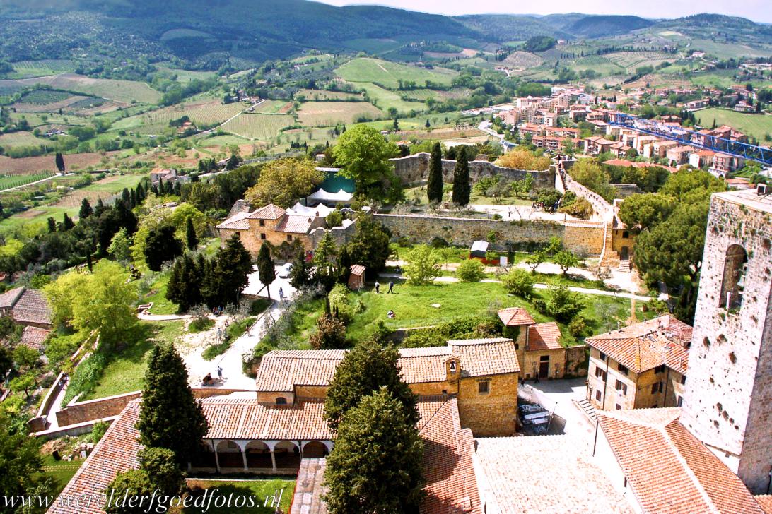 Het historisch centrum van San Gimignano: San Gimignano is een goed bewaard gebleven ommuurde middeleeuwse stad in Italië. San Gimignano ligt ongeveer 50 km ten zuiden van Florence en ongeveer 40 km ten noorden van Siena. De stad lag aan een drukke handelsroute en was een rustpunt voor pelgrims, die reisden over de Via Francigena, een historische pelgrimsweg die van Canterbury in Engeland naar Rome en Vaticaanstad en vervolgens naar Puglia in Italië liep, mede door de gunstige ligging aan deze routes werd San Gimignano in de 12de en 13de eeuw een belangrijke stad. Later werd San Gimignano door het verleggen van de pelgrimsroute een onbelangrijke stad. Tegenwoordig is San Gimignano bekend door de torens. De torens van San Gimignano werden in de 12de en 13de eeuw door rijke adellijke families gebouwd als symbool van hun macht en rijkdom. Het silhouet van de stad valt van ver op. De majestueuze torens sieren de skyline van San Gimignano. Van de 72 torens zijn er nu nog 14 over. Rijke kooplieden uit Regensburg in Duitsland, met handelsbetrekkingen door Europa, zagen de torens van San Gimignano en bouwden vergelijkbare torens in hun eigen stad. Een mooi uitzicht over San Gimignano en Toscane heb je vanaf de Torre Grossa. Museo Civico geeft toegang tot de Torre Grossa, Palazzo Comunale en de Pinacoteca. In de 'Sala di Dante' is een inscriptie ter herinnering aan een bezoek van de dichter en schrijver Dante in 1300. De 10de eeuwse Collegiata is de hoofdkerk van San Gimignano, de Collegiatakerk is gedecoreerd met een serie fresco's met scenes uit de bijbel en een met gouden sterren beschilderd gewelf. Het historisch centrum van San Gimignano werd in 1990 een Werelderfgoed van UNESCO en staat ingeschreven op de Werelderfgoedlijst van UNESCO als: Historic Centre of San Gimignano.