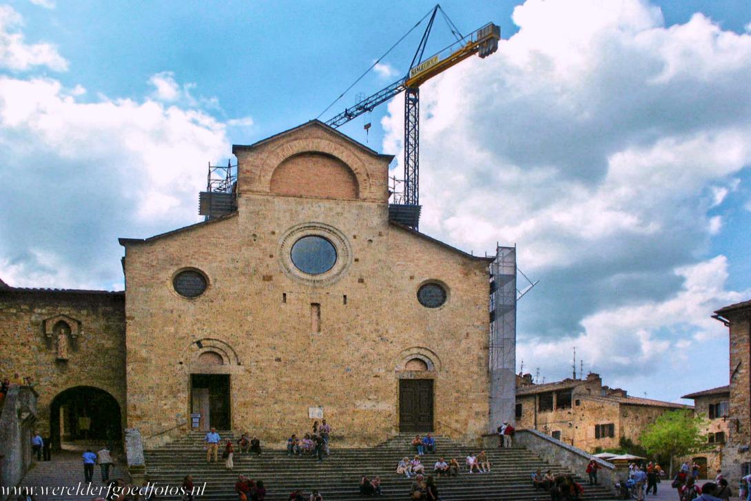 Het historisch centrum van San Gimignano: De Collegiale kerk werd gewijd in 1148 en is gewijd aan St. Geminianus of St. Gimignano, de patroonheilige van San Gimignano, de relikwieën van deze heilige zijn ondergebracht in de kerk. De vrij eenvoudige gevel dateert uit 1239, maar het interieur is weelderig gedecoreerd met fresco's, waarvan de meeste uit de 14de eeuw dateren. Het gewelf is beschilderd met gouden sterren op een diepblauwe achtergrond.