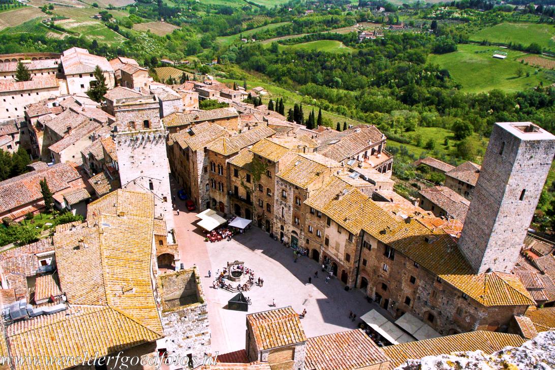 Historisch centrum van San Gimignano: De Piazza della Cisterna, gezien vanaf de Torre Grossa, de hoogste toren van de stad. Op de Piazza della Cisterna, het driehoekvormige marktplein van San Gimignano, staat in het midden een achthoekige fontein, in 1346 gemaak van travertijn. Het historisch centrum van San Gimignano kreeg in 1990 de status Werelderfgoed van UNESCO.