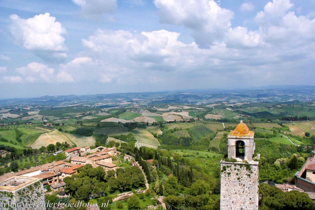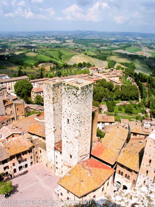 Historisch centrum van San Gimignano: De Torre Rognosa en de Tweelingtorens, omringd door de heuvels van Toscane, gezien vanaf de Torre Grossa. De Torre Grossa werd in 1311 gebouwd, de toren is 54 meter hoog en de hoogste toren van San Gimignano. Het is een herkenningspunt in de omgeving van San Gimignano.