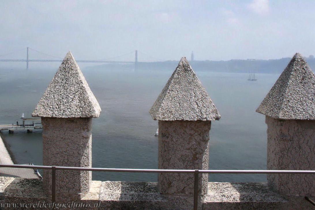 De brug Ponte 25 de Abril, gezien vanaf de Toren van Belém, een torenfort in de Taag. De brug is een van de bezienswaardigheden van Lissabon. De brug overspant de rivier de Taag op haar smalste punt. De brug wordt vaak vergeken met de Golden Gate Bridge in San Francisco. De Toren van Belém en het Hiëronymietenklooster in Lissabon vormen samen een Werelderfgoed van UNESCO. De Toren van Belém en het Hiëronymietenklooster werden in 1983 ingeschreven op de Werelderfgoedlijst van UNESCO.