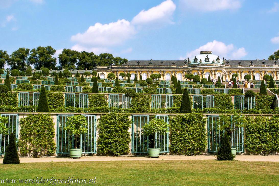 Paleizen en parken van Potsdam en Berlijn: De beroemde terrasvormige wijngaarden voor Slot Sanssouci. Het paleis bevindt zich in Park Sanssouci in Potsdam. Koning Frederik de Grote gaf opdracht voor de aanleg van groentetuinen en boomgaarden. De boomgaarden en broeikassen werden beplant met meer dan drieduizend fruitbomen, zoals bananen, sinaasappels, perziken en vijgen. Frederik de Grote noemde Slot Sanssouci liefkozend 'mein Weinberghäuschen' (mijn wijngaardhuisje).