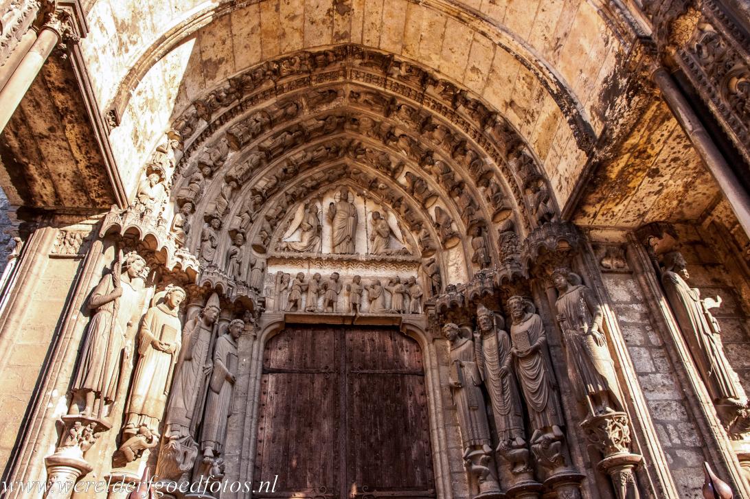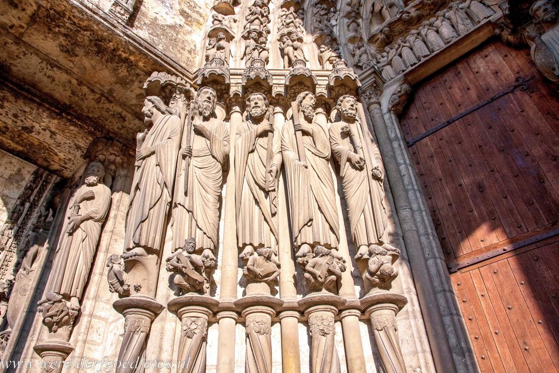 Kathedraal van Chartres: Het zuidportaal is gedecoreerd met beelden van de twaalf apostelen. De kathedraal staat in het middeleeuwse centrum van de Franse stad Chartres. Sinds de bouw in 1194 doorstond de kathedraal vele eeuwen, oorlogen en de Franse Revolutie. Tijdens WOI en WOII werden de glas-in-lood ramen veilig opgeborgen en na de oorlog weer teruggeplaatst.