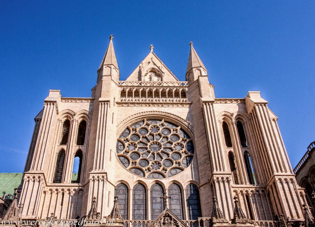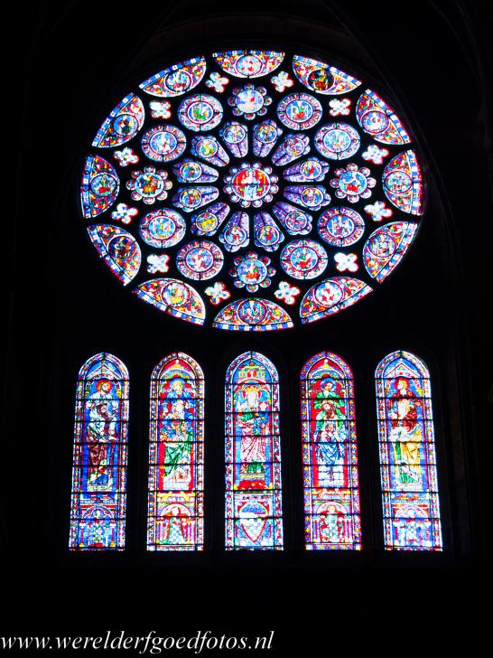 Kathedraal van Chartres: Het roosvenster in de zuidtfaçade verbeeldt de Apocalyps, Maria met het kind Jezus, de profeten en de evangelisten. Sinds de 14de eeuw worden aan de kathedraal van Chartres voortdurend restauraties verricht, de belangrijkste vonden plaats in de 19de en 20ste eeuw. De kathedraal van Chartres kreeg in 1979 de status Werelderfgoed van UNESCO.