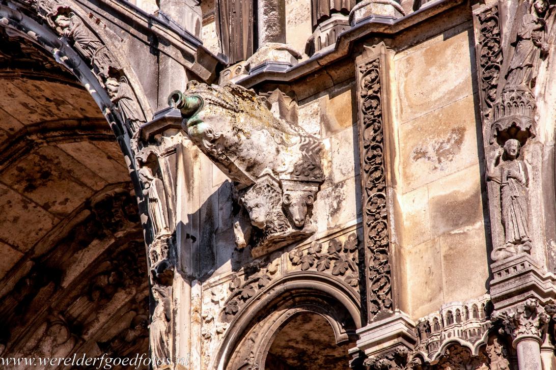 Kathedraal van Chartres: Een waterspuwer in het zuidportaal, rond de waterspuwers van het zuidportaal is veel klein beeldhouwwerk te bewonderen. De negen portalen van de kathedraal zijn verfraaid met ruim 4000 beelden, de 12de en 13de eeuwse beelden zijn uniek in Frankrijk. De Kathedraal van Chartres werd in 1979 ingeschreven op de Werelderfgoedlijst van UNESCO.
