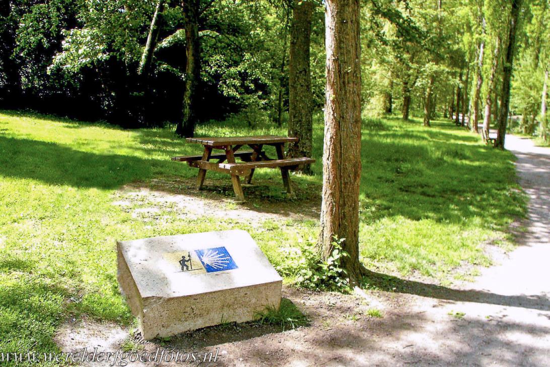 Een wegwijzer met een sint jacobsschelp, het iconische symbool van de bedevaartsroute naar Santiago de Compostela, bij de kathedraal van Chartres, een van de belangrijkste stopplaatsen in Frankrijk voor bedevaartgangers, die op weg zijn naar Santiago de Compostela in Spanje. De route naar Santiago de Compostela (Camino de Santiago) is ook een UNESCO Werelderfgoed.