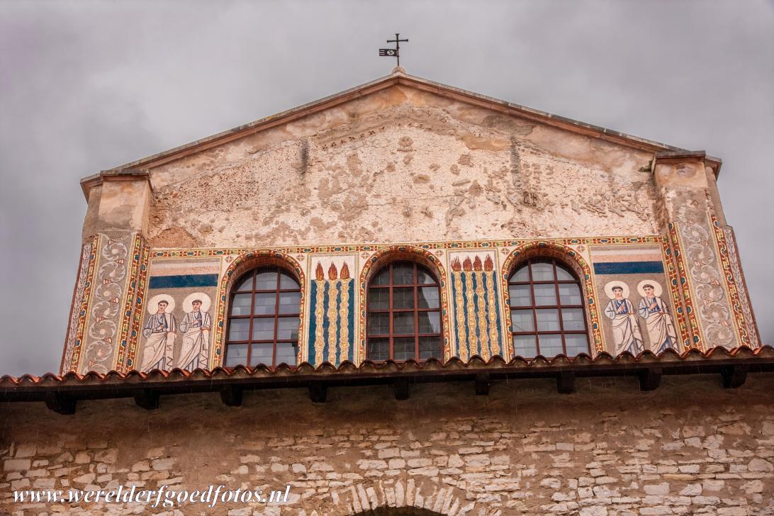 Historisch centrum van Poreč: De façade van de Euphrasiusbasiliek gezien vanuit het atrium, de façade is gedecoreerd met Byzantijnse mozaïeken. De Euphrasiubasiliek werd gebouwd tijdens de Byzantijnse tijd. Het episcopaal complex in Poreč bestaat uit een aantal gebouwen, die voor het merendeel in dezelfde periode werden gebouwd, waaronder de basiliek en een doopkapel.