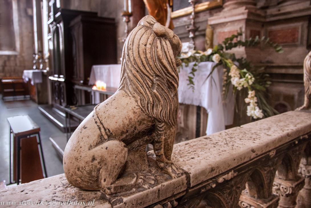 De St. Jacobuskathedraal in Šibenik: Een van de twee gebeeldhouwde stenen leeuwen op het koorhek. Het interieur van de kathedraal is bijna helemaal van zandsteen of marmer. De stenen koorstoelen werden vervaardigd door de bouwmeesters van de kathedraal, Juraj Dalmatinac en Nikola Firentinac. Het middenschip van de kathedraal wordt ondersteund door hoge zuilen met gebeeldhouwde korinthische kapitelen.