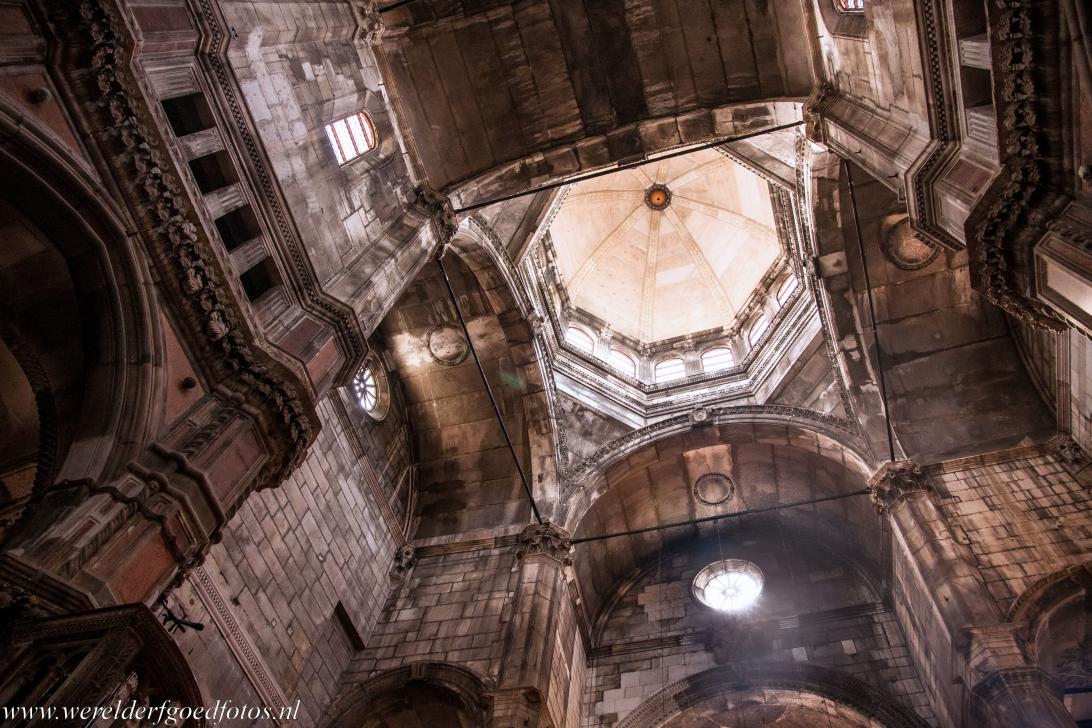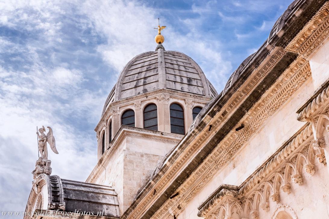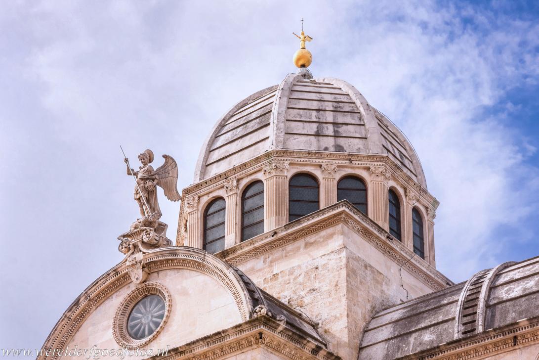 St. Jacobuskathedraal in Šibenik: Op de koepel staat een standbeeld van St. Michaël. De koepel van de kathedraal staat op een vierkante constructie, in de kathedraal zijn vier stenen zuilen te zien, waarop de dakconstructie rust. De kathedraal is zowel een religieus als een architecturaal monument. De St. Jacobuskathedraal staat in Šibenik, een stad aan de kust van Kroatië tussen de steden Zagreb en Split.
