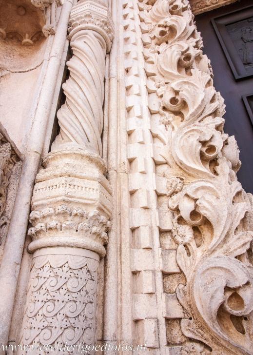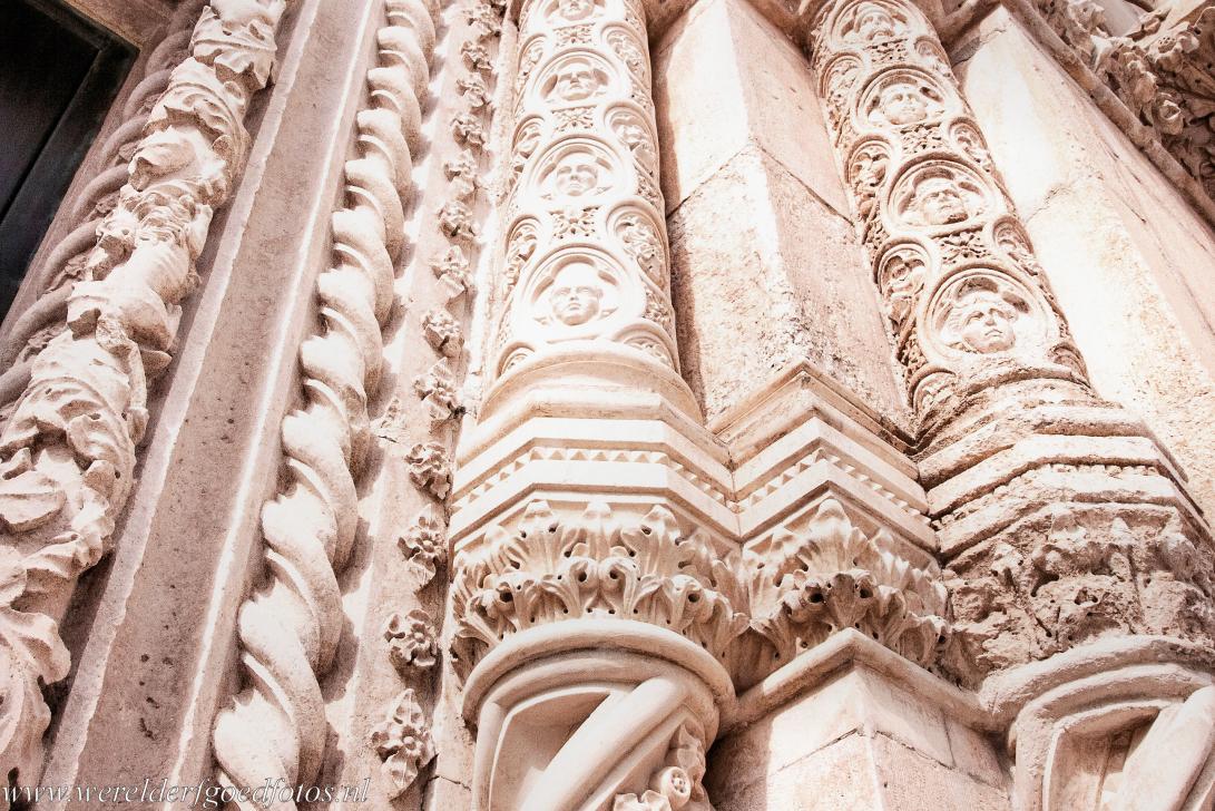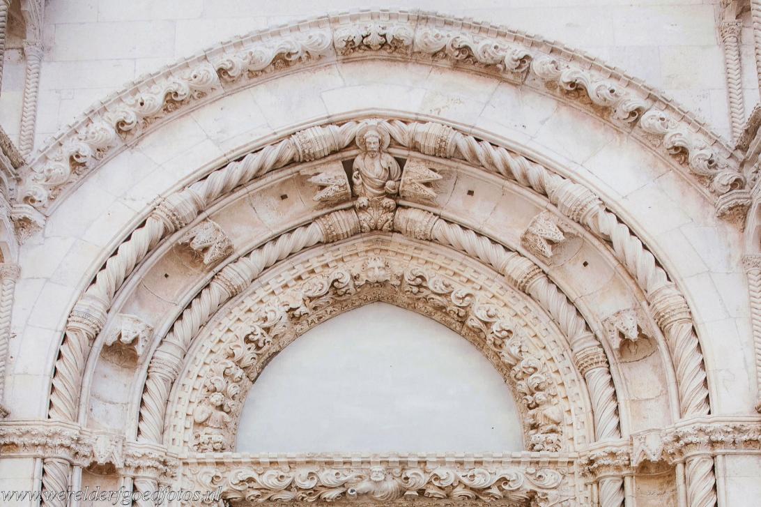 De St. Jacobuskathedraal in Šibenik: Een detail van de fraai gebeeldhouwde Leeuwenpoort, het noordelijke portaal van de St. Jacobuskathedraal. De vorm en de decoraties van de kathedraal illustreren het succesvolle samengaan tussen de gotische en renaissancestijl. Er wordt gezegd, dat als een denkbeeldige lijn van het hoofdportaal naar de apsis zou worden verlengd, ze naar Jeruzalem wijst.