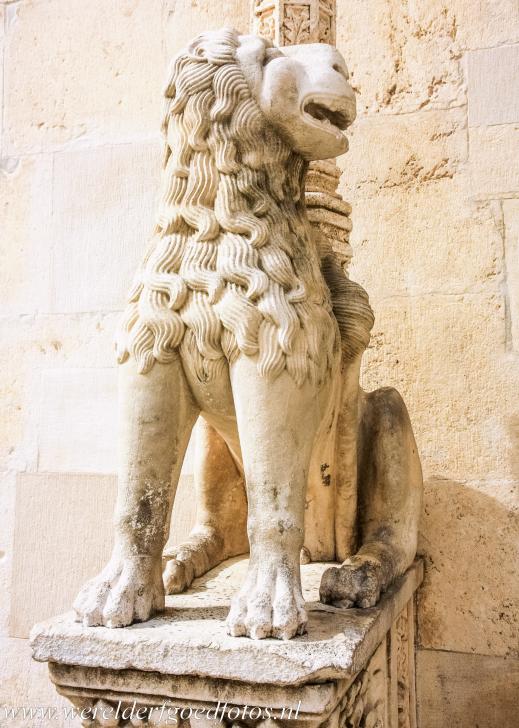 De St. Jacobuskathedraal in Šibenik: Een van de twee stenen leeuwen van de Leeuwenpoort. De Leeuwenpoort bevindt zich in de zijgevel van de kathedraal, het portaal werd genoemd naar de twee stenen leeuwen, die net als bij de Laurentiuskathedraal in Trogir, zuilen met beelden van Adam en Eva op hun rug dragen. Boven Adem en Eva staan de beelden van de apostelen Petrus en Paulus, op de muur boven de Leeuwenpoort staan drie wapenschilden.
